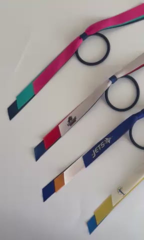 Personalise your team's hair ribbon with a professional branded design! Our sport bows and ribbons are attached to an elastic for easy wear. Alternatively go for a custom printed hair ribbon available on a ribbon roll or heat cut. Your ribbon can incorporate your club's name, a custom colour, team crest or your own design to complement your team or school uniform. Ideal for Netball, Girls' Team Sports, Dance & Cheer. Quality sublimation print that doesn't smudge off. Low MOQ and wholesale prices, save when you buy in bulk!